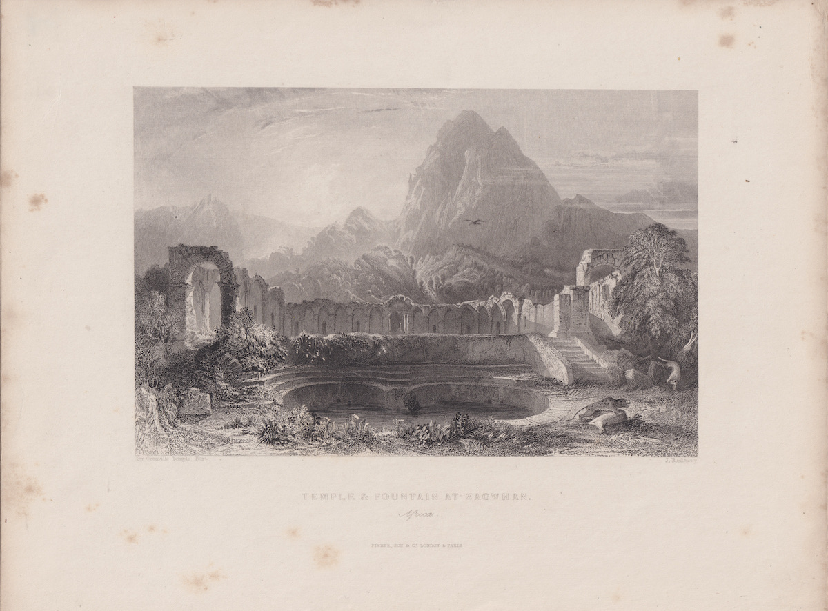 Antique Engraving Print, Temple & Fountain at Zagwhan, 1840