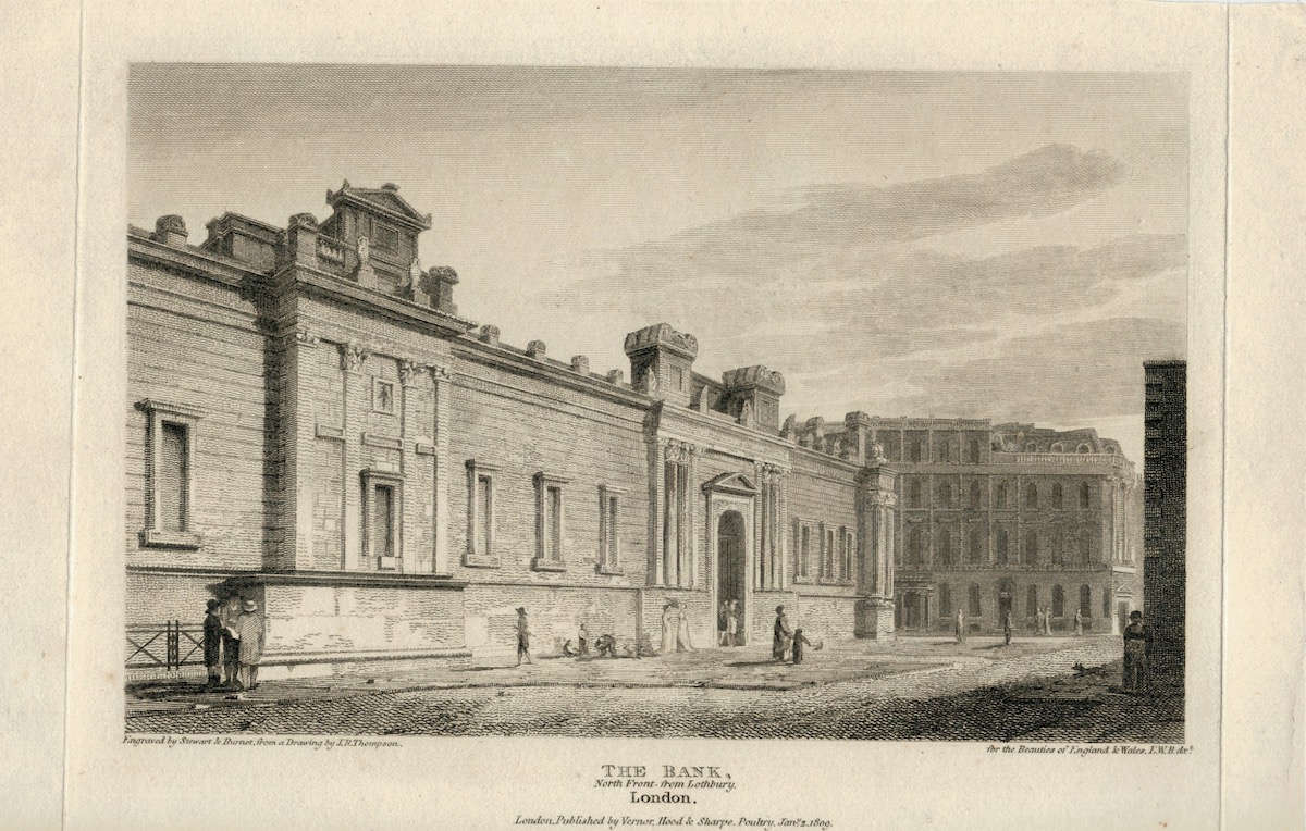 Antique Engraving Print, The Bank, London, 1809, 19,6 x 12,6. Engraved by Stewart & Burnet from a drawing by J. R. Thompson, published by Vernor.