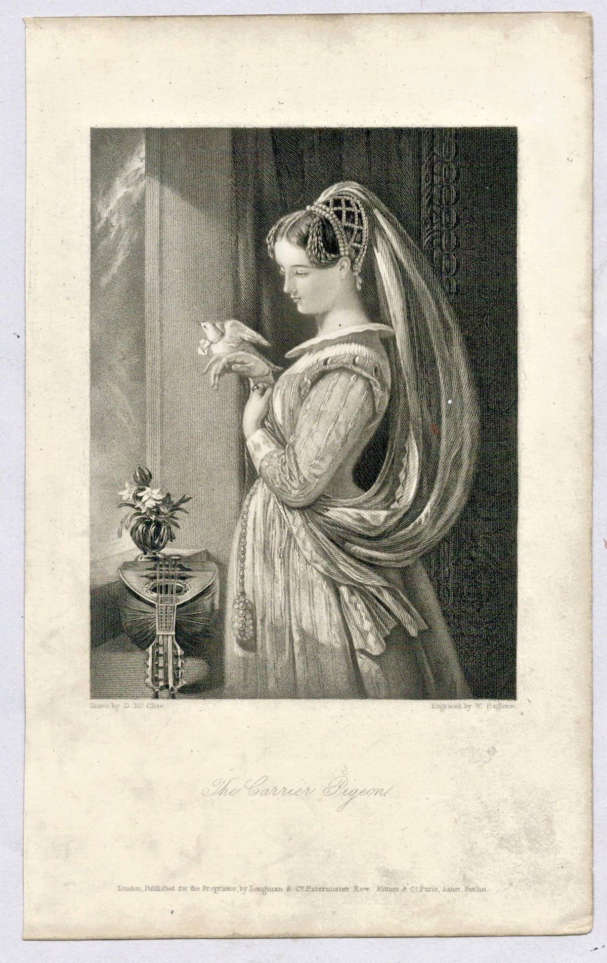 Antique Engraving Print, The Carrier Pigeon, cm. 12 x 19. Engraved by W.Eagleton after D.Mac Clise, From the book “Heath’s Book of Beauty, 1835.