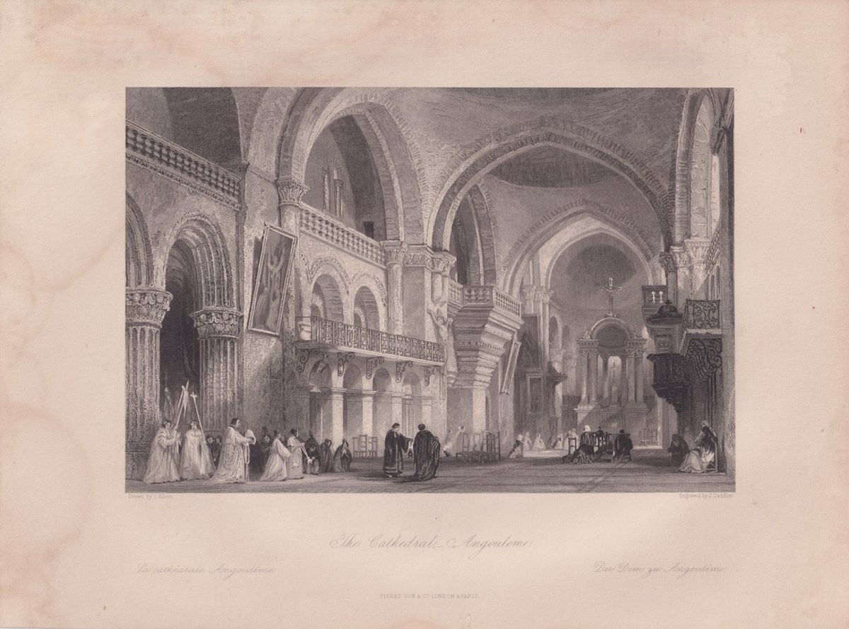 Antique Engraving Print, The Cathedral, Angouleme, 1840, engraved by J. Saddler, 27,5 x 20,5 cm.