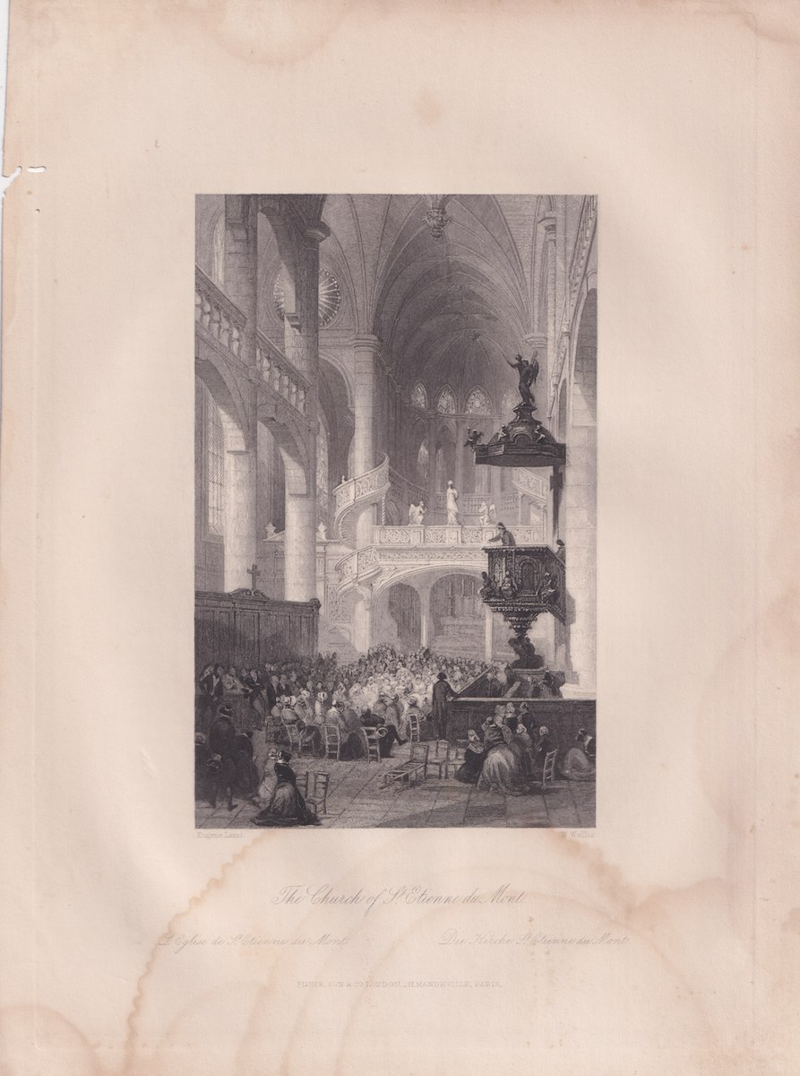 Antique Engraving Print, The Church of St. Etienne du Mont, 1840, 27,5 x 20,5 cm. Engraved by W. Wallis.