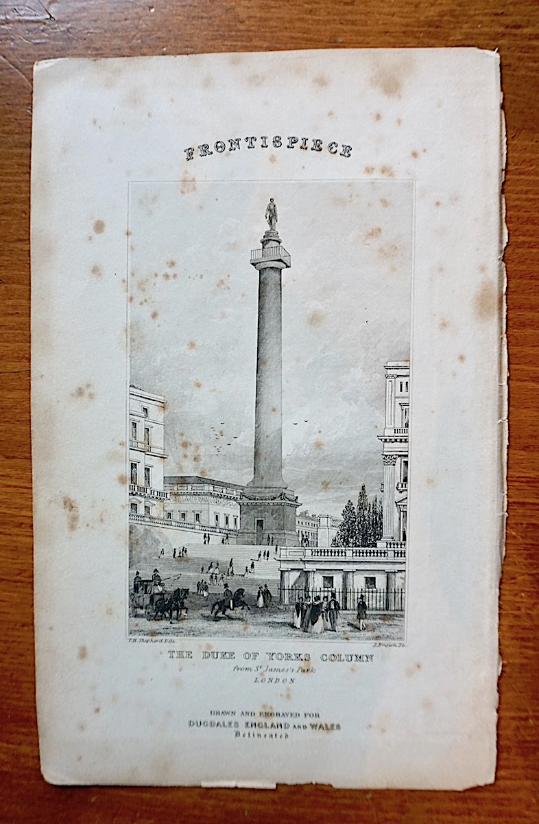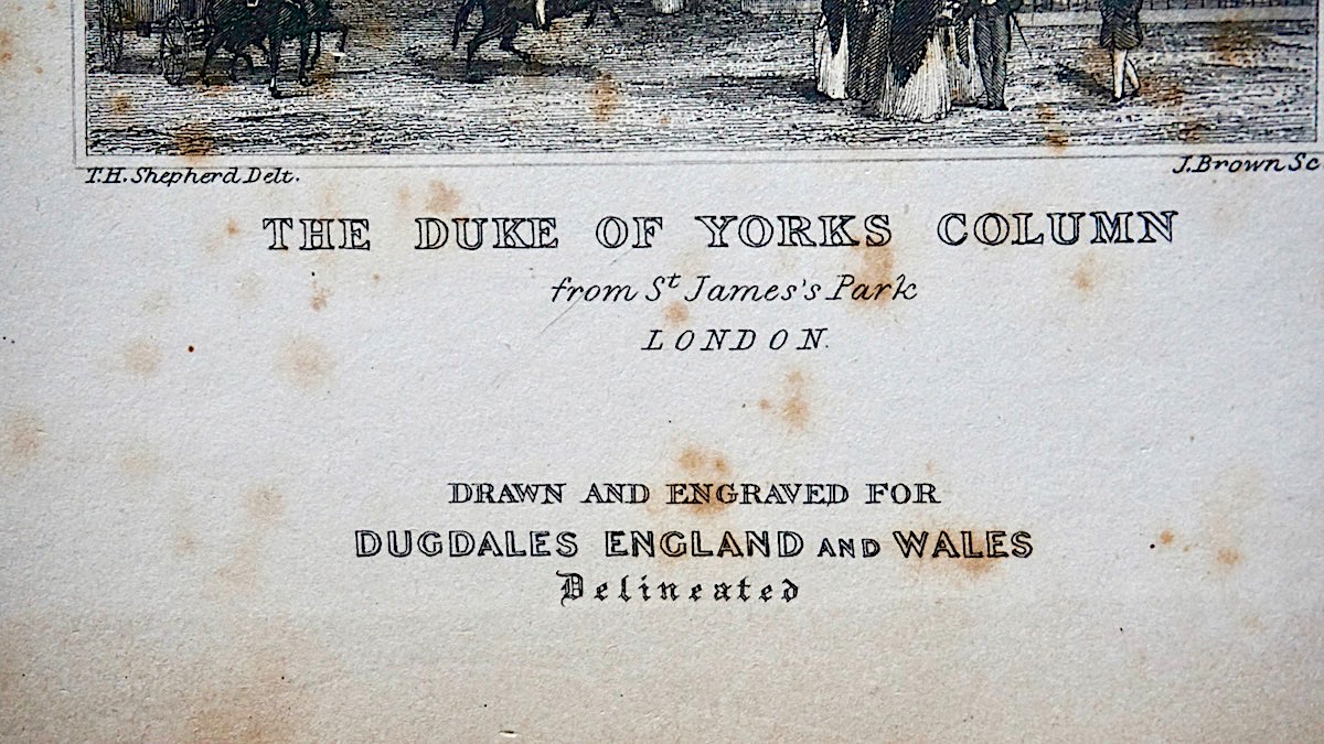 Antique engraving print: “The Duke of Yorks Column from St. James’s Park, London”, 1860. Originally produced for Thomas Dugdale’s part-work survey published as “The Curiosities of Great Britain” or “England Delineated” in various formats between 1838 and 1860. An attractive antique print – a view of the Duke of York’s Column from the foot of the steps. Engraved by J. Brown from an original study by Thomas Hosmer Shepherd.