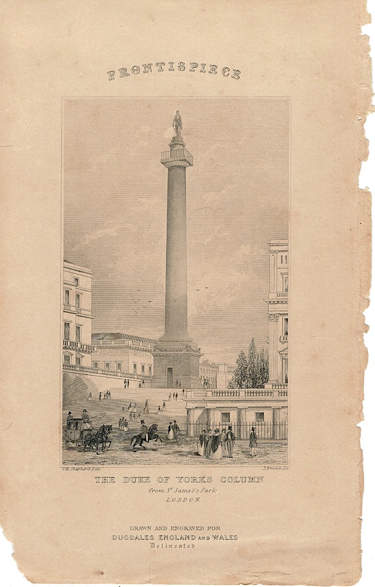 Antique engraving print: “The Duke of Yorks Column from St. James’s Park, London”, 1860. Originally produced for Thomas Dugdale’s part-work survey published as “The Curiosities of Great Britain” or “England Delineated” in various formats between 1838 and 1860. An attractive antique print – a view of the Duke of York’s Column from the foot of the steps. Engraved by J. Brown from an original study by Thomas Hosmer Shepherd.