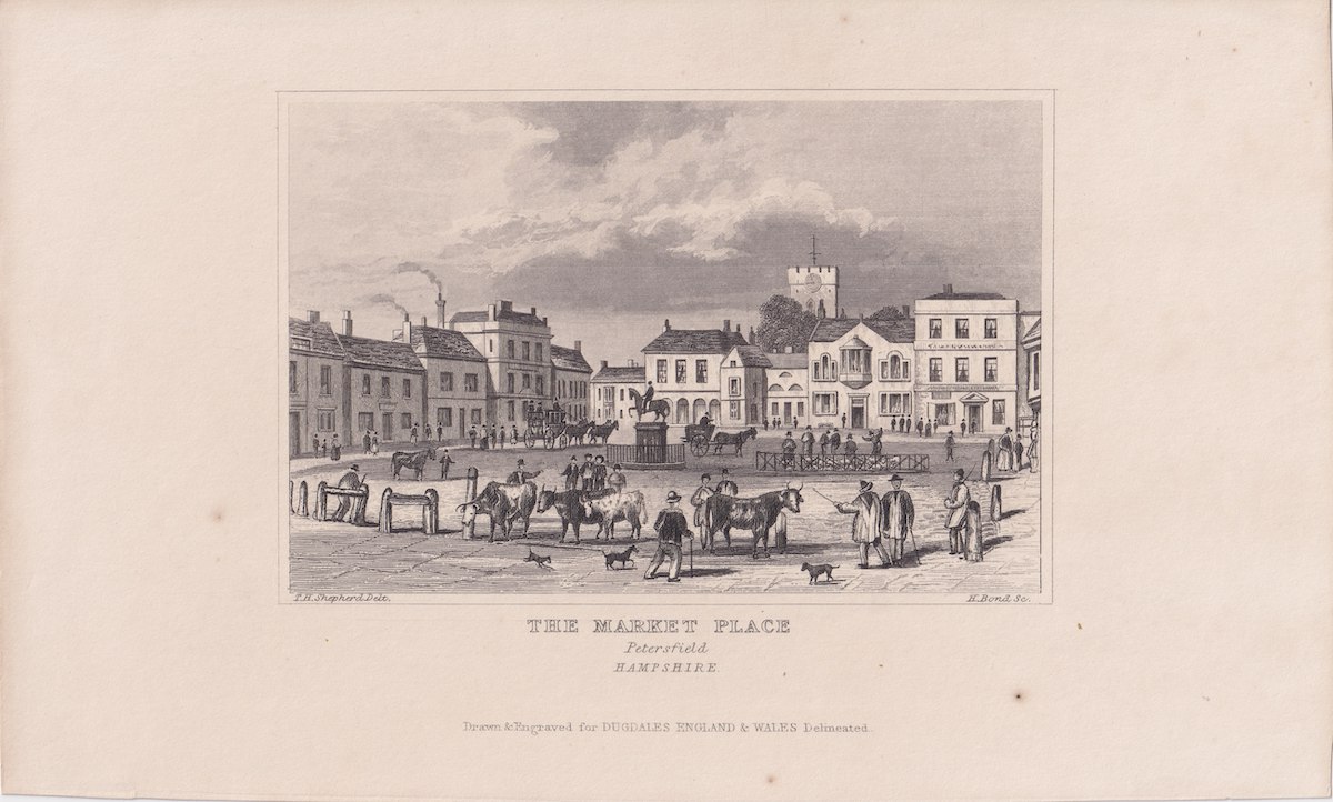 Antique Engraving Print, The Market Place, 1820, 22 x 13.4 cm. Petersfield. Hampshire.