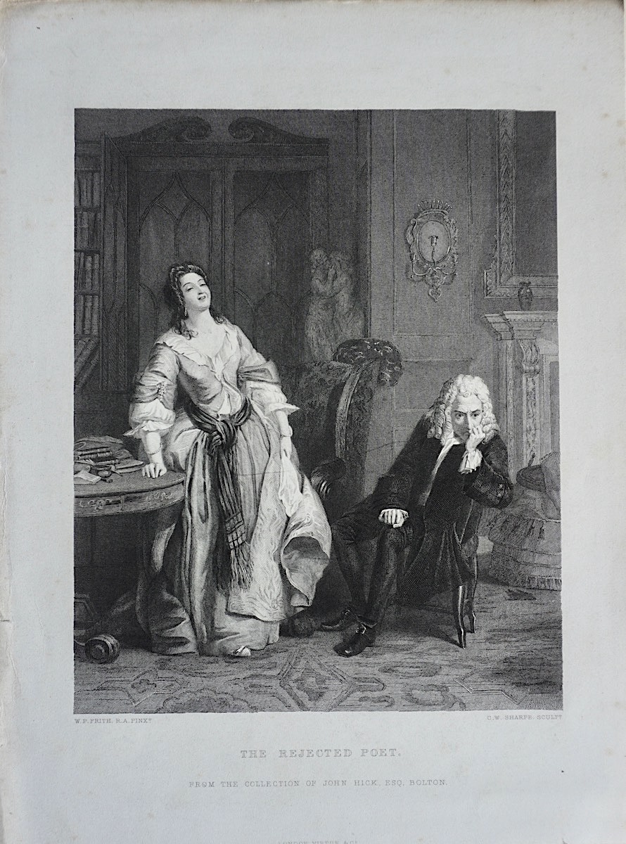 Antique Engraving Print, The Rejected Poet, 1865, from the collection of John Hick. Esq. Bolton, London, Virtue & Co. Engraved by C.W. Sharpe after a painting by W.P. Frith, 32,2 x 23,8 cm.