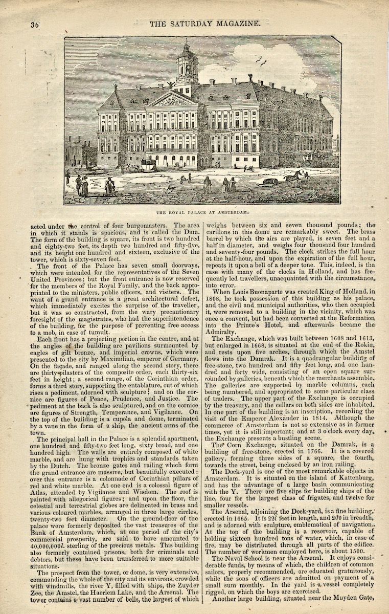 Antique Engraving Print, The Royal Palace at Amsterdam, 1834, from The Saturday Magazine, Supplement for January 1834, cm. 28 x 18.