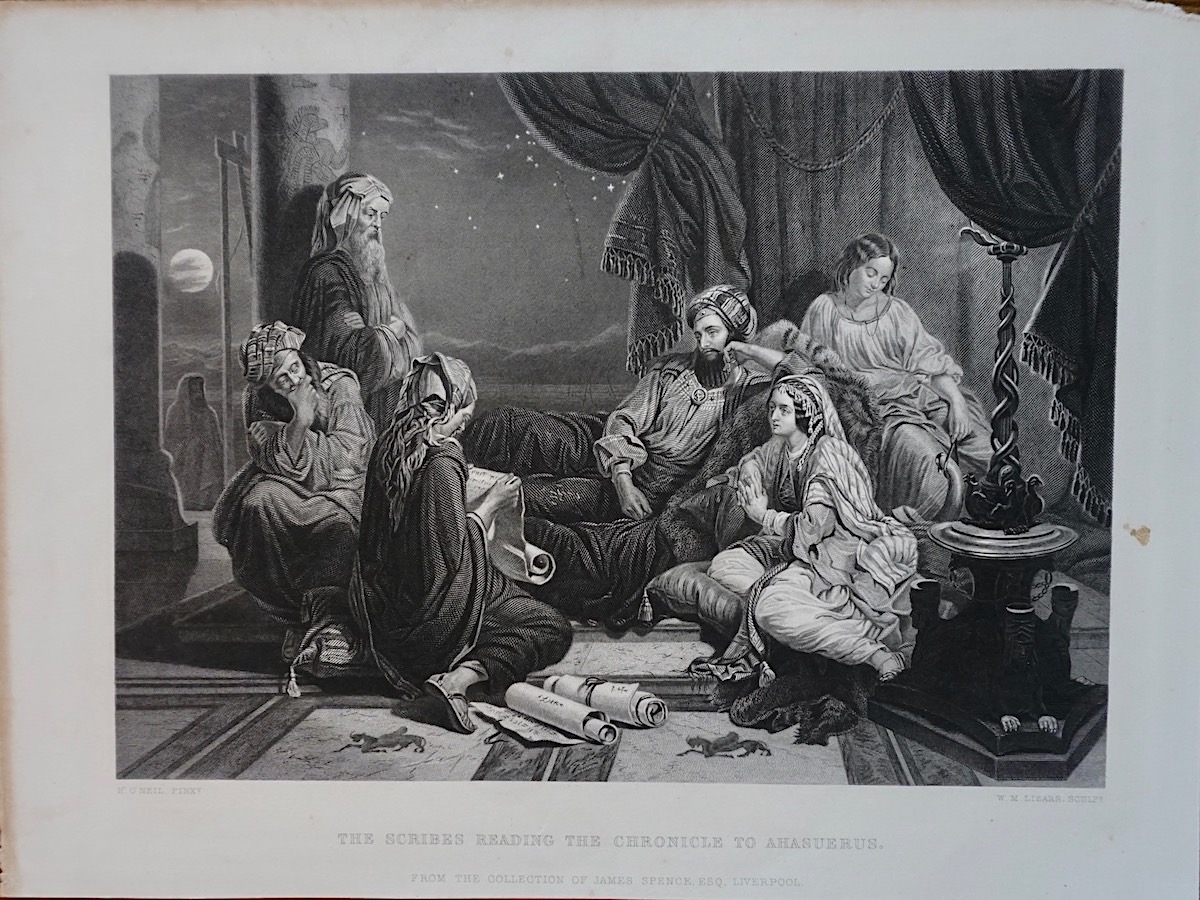 Antique Engraving Print, The Scribes Reading the Chronicle to Ahasuerus, 1867, engraved by W.M. Lizars, 30,2 x 22,7 cm.