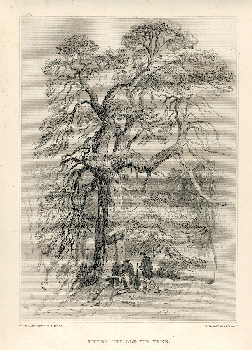 Antique Engraving Print, Under the Old Fir Tree, 1877, 32 x 24,9 cm. (Scottish scene) engraved by C.G.Lewis after a picture by Edwin Landseer.