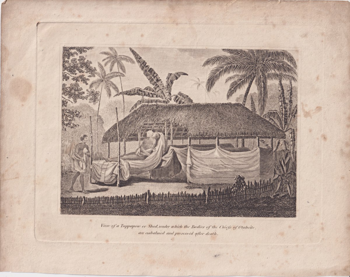 Antique Engraving Print, View of a Tuppapow, under which the Bodies of the Chiefs of Otaheite are embalmed and preserved after death, 1793-1801, 20.8 x 26.4 cm.