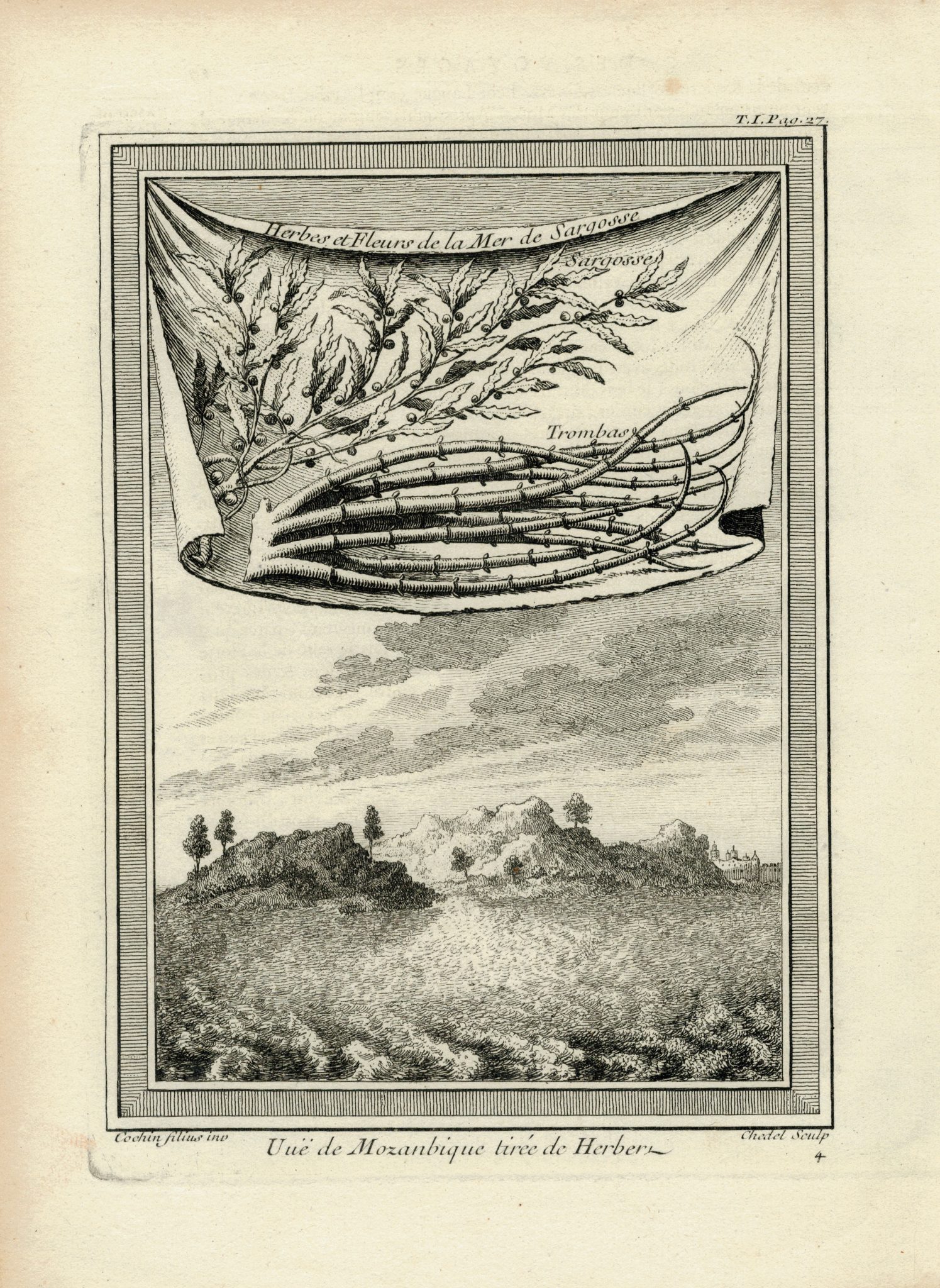 Antique Engraving Print, Vue de Mozanbique tirée de Herbers, and Herbes et Fleurs de la Mer de Sargosse, 1755 Chedel Sculp. 25,6 x 18,8 cm.
