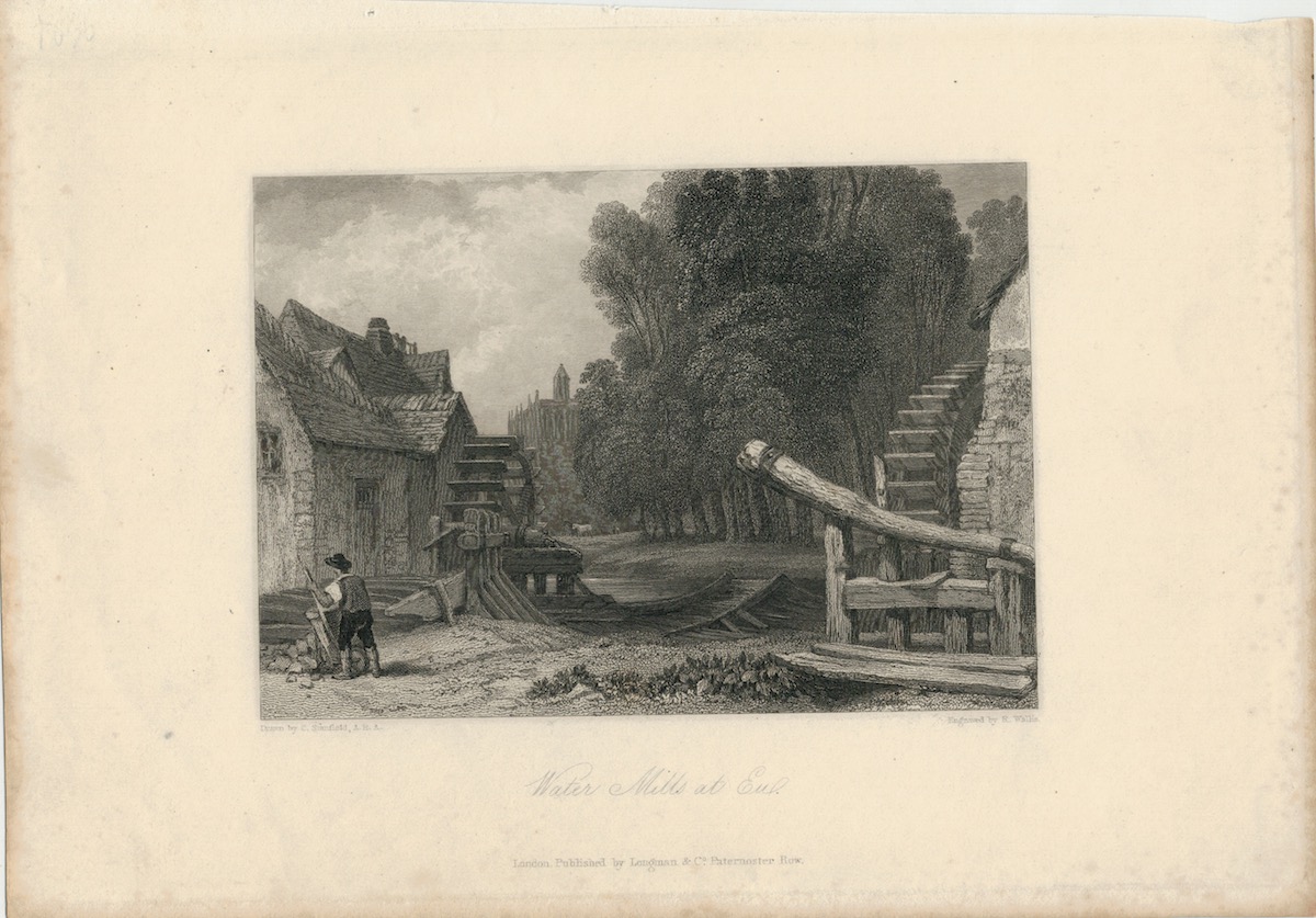 Antique Engraving Print, Water Mill at Eu, 1836, 22,8 x 15,6 cm. Engraved by R. Wallis.