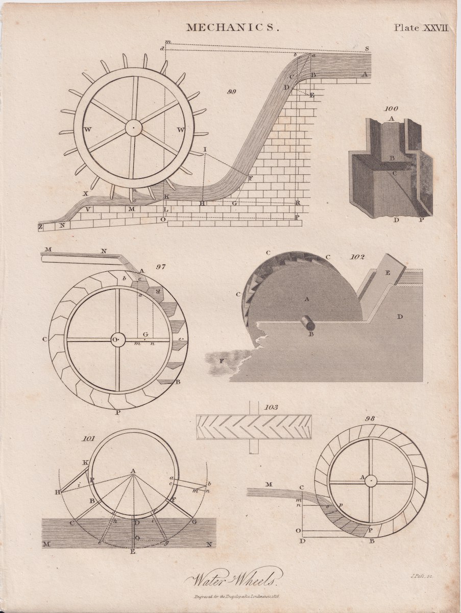 Antique Engraving Print, Water Wheels, 1816, credit Antiche Curiosità©