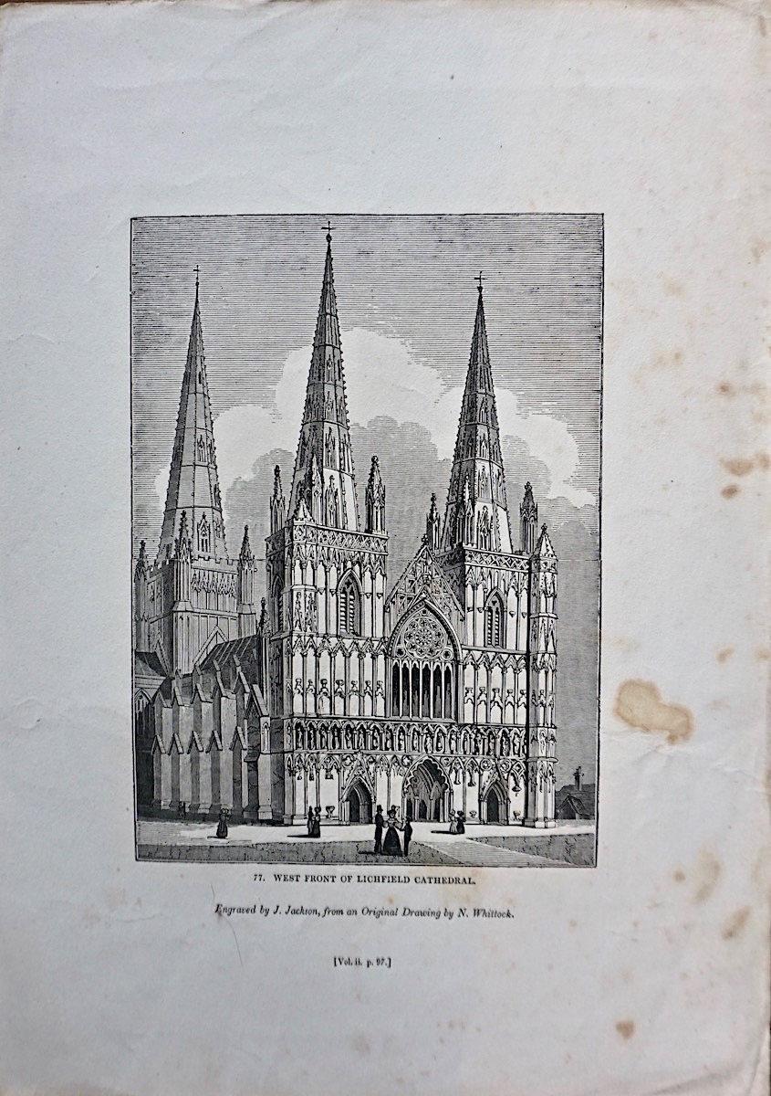 Antique Engraving Print, West Front of Lichfield Cathedral, 1835, cm. 34,4, x 24. Engraved by J. Jackson, from an original drawing by N. Whittock.