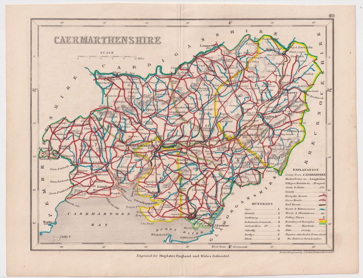 Antique Map, Caermarthenshire, 1840, 27 x 20.7 cm. Engraved for Dugdales England and Wales Delineated.