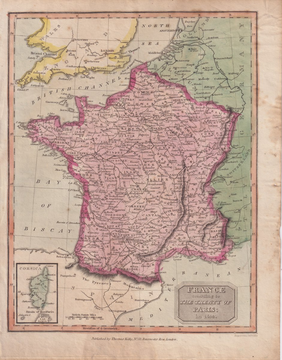 Antique Map, France according to the treaty of Paris in 1814, credit Antiche Curiosità©