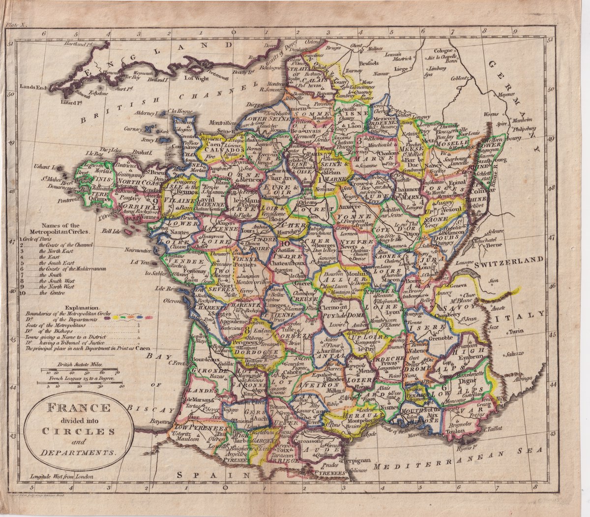 Antique Map, France divided into circles and departments, 1800, 20.5 x 23 cm.