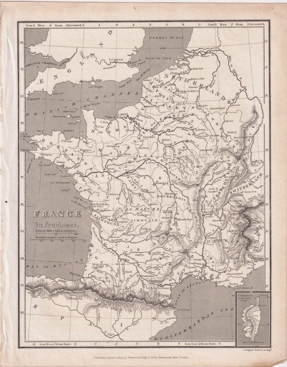 Antique Map, France in provinces, 1809, 27 x 21.4 cm.