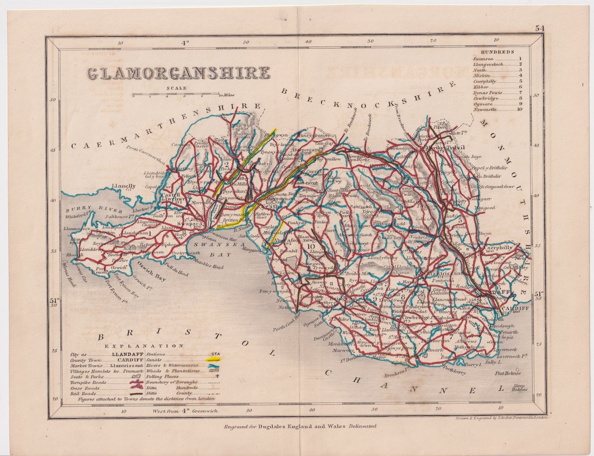 Antique Map, Glamorganshire, 1845, 27 x 25,8 cm. Engraved for Dugdales England and Wales Delineated.