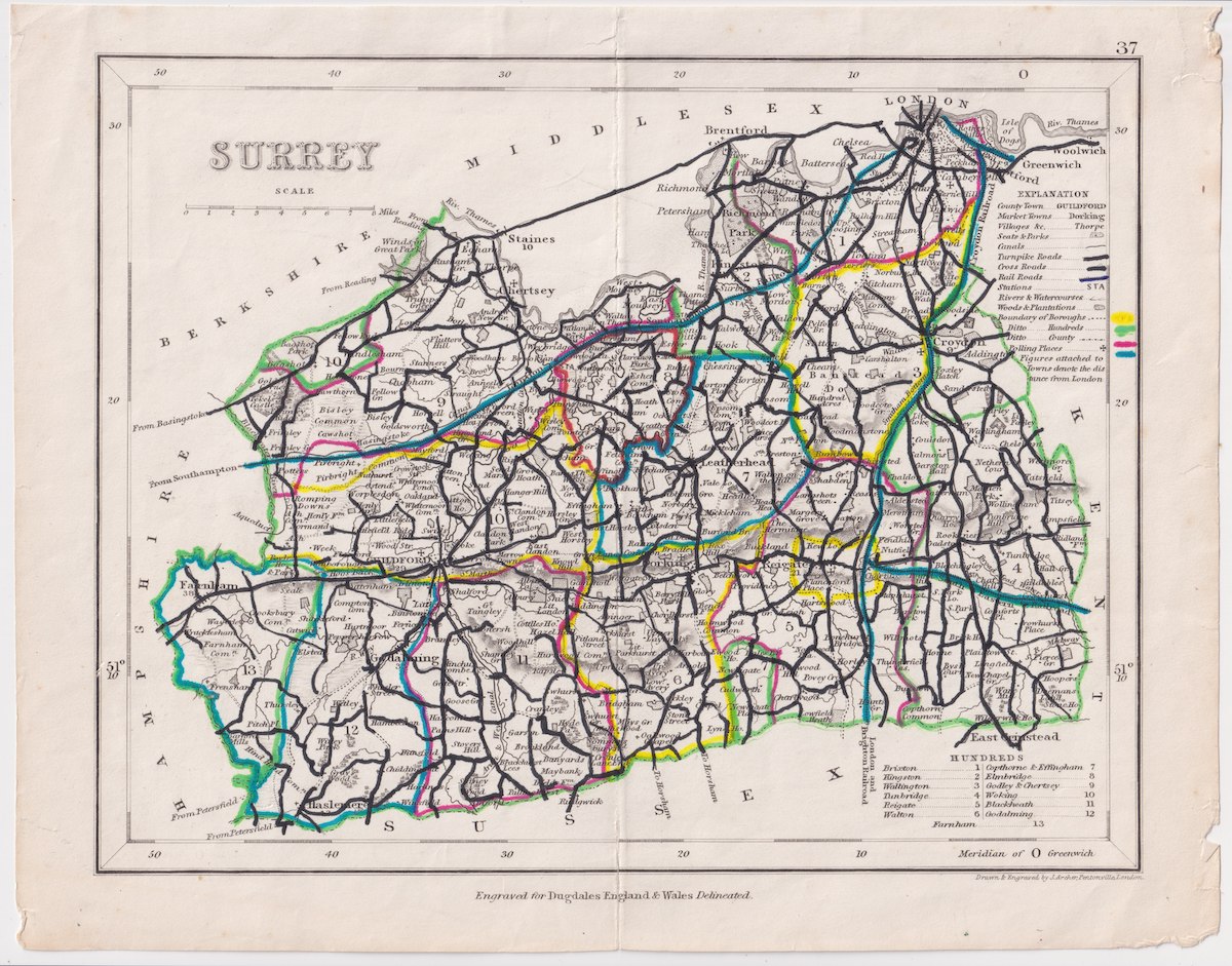 Antique Map, Surrey, 1840, 26.5 x 21 cm. Dugdales.