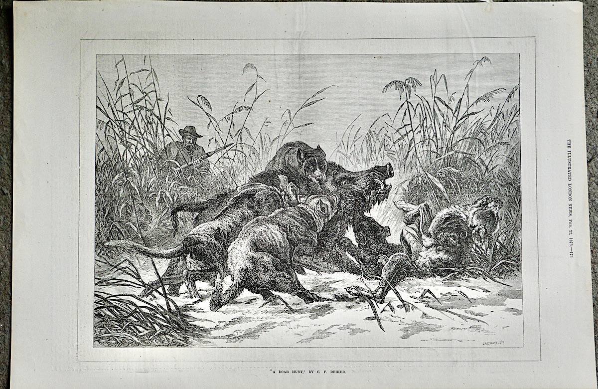 Antique Print, A boar Hunt by C.F. Deiker, 1873