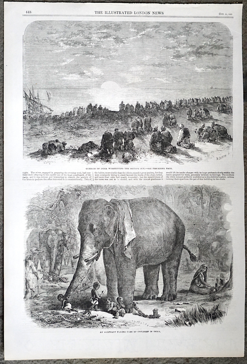 Antique Print, An Elephant; Guebers of India, 1863, 40.3 x 27.2 cm.
