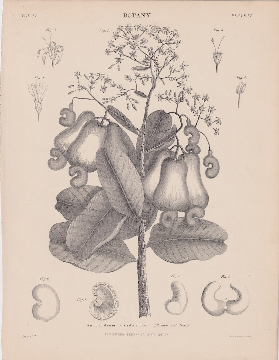 Antique Print, Anacardium occidentale, Cashew nut Tree, 1889, credit Antiche Curiosità©