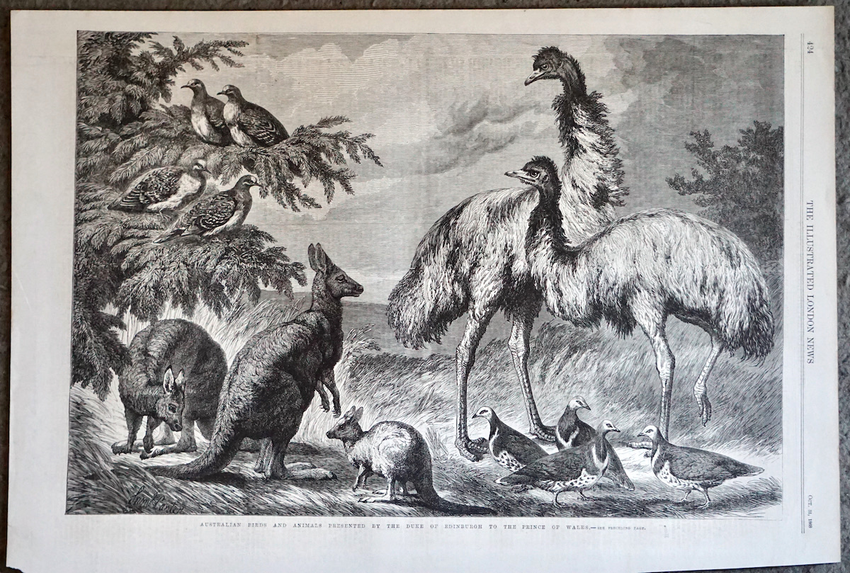 Antique Print, Australian Birds and Animals, 1868, 39.6 x 27 cm.