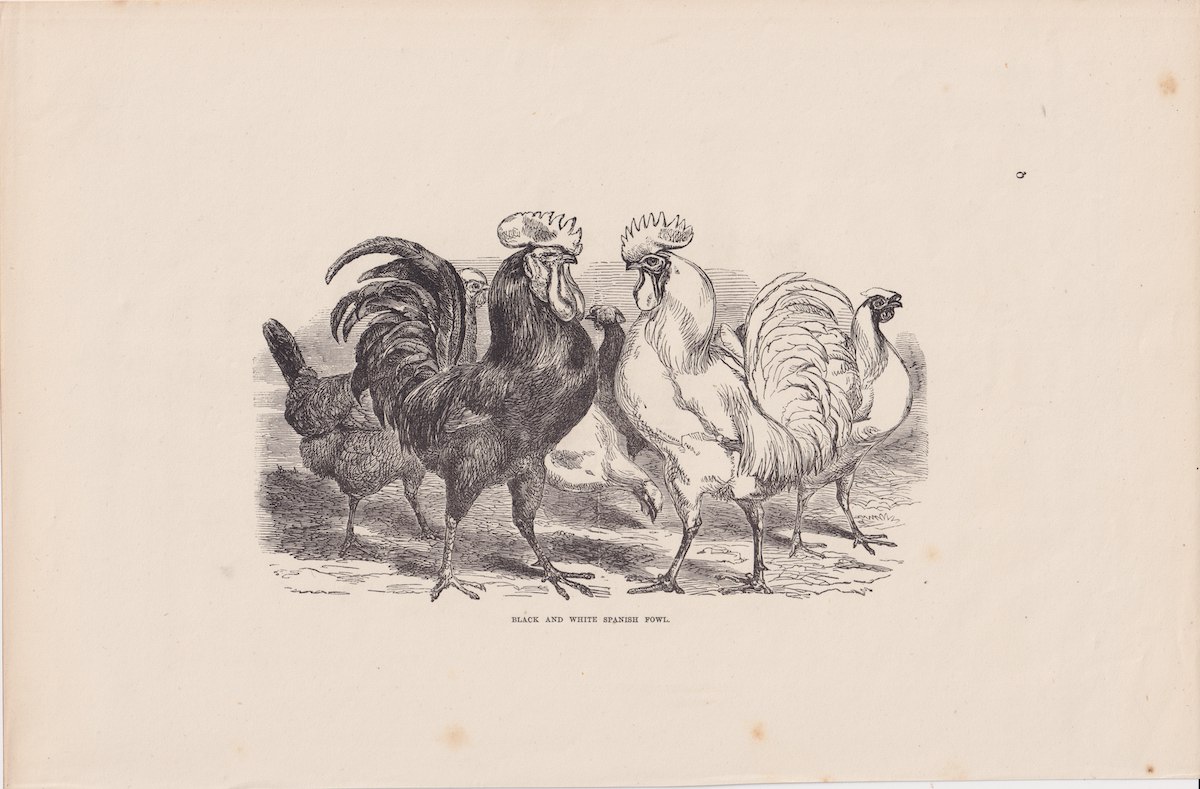 Antique Print, Black and White Spanish Fowl, 1880, credit Antiche Curiosità©