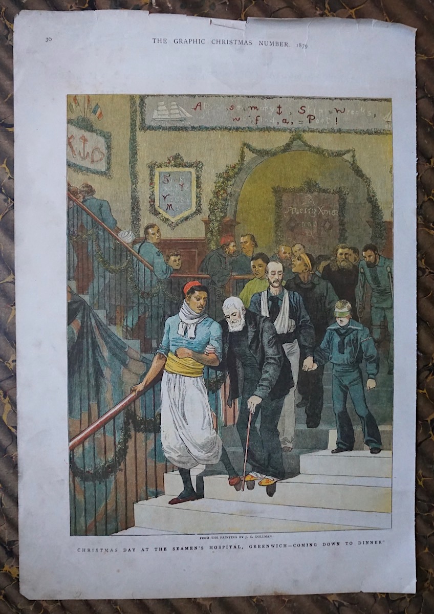Antique Print, Christmas Day at the Seamen’s Hospital, Greenwich-Coming Down to Dinner, from The Graphic Christmas Number, 1879, from the painting by J.C.Dollman, 40,5 x 27,7 cm.