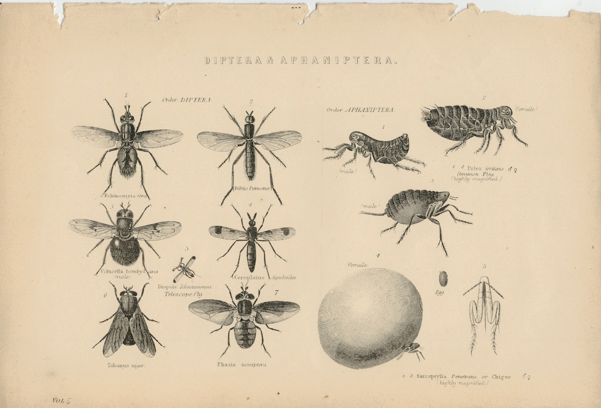 Antique Print, Diptera & Aphaniptera, 1870, credit Antiche Curiosità©