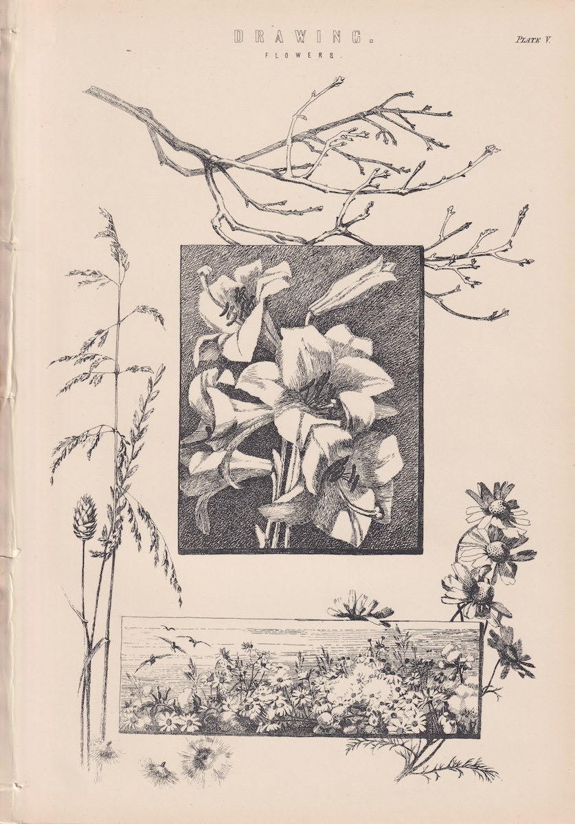 Antique Print, Drawing, Flowers, 1870, 19 x 27 cm.