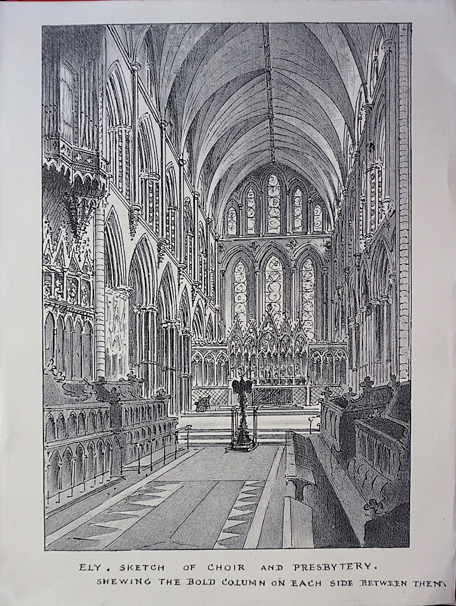 Antique Print, Ely, Sketch of Choir and Presbytery. Shewing the Bold Column on Each Side Between Them, 1870, 24 x 31,3 cm.