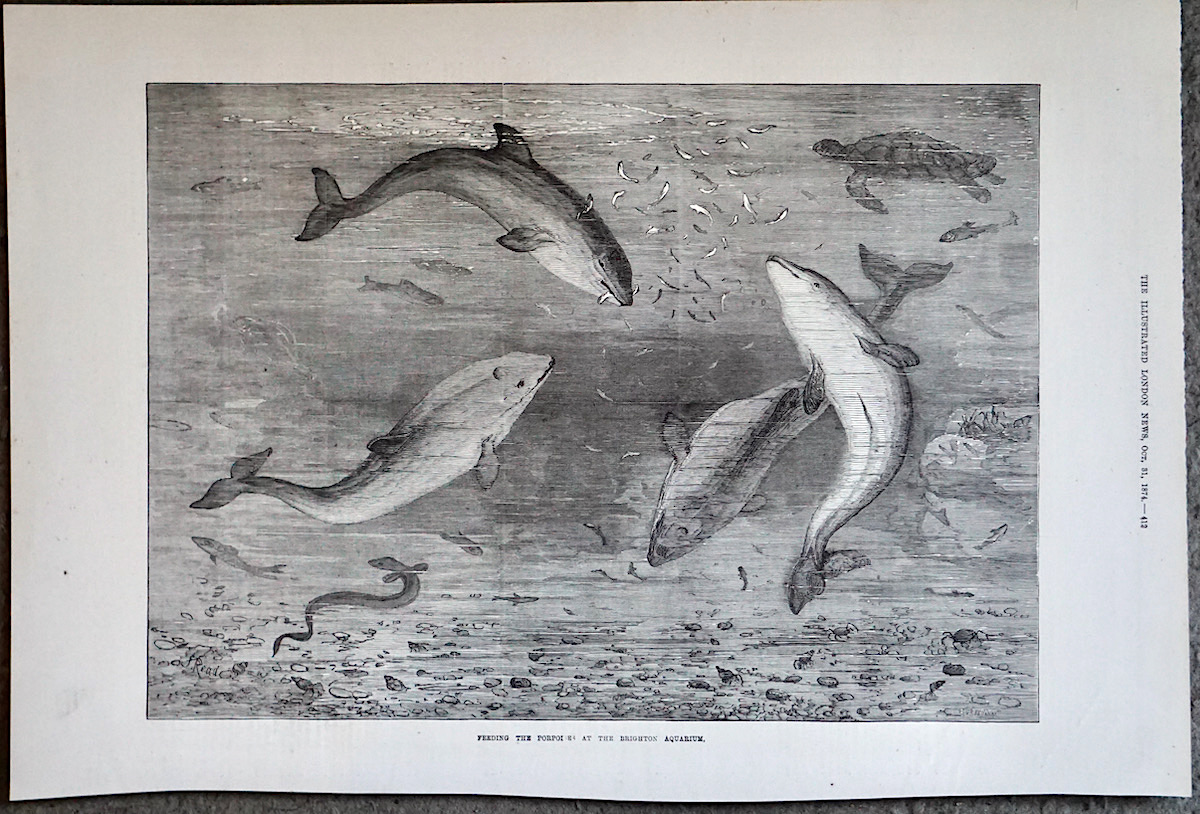 Antique Print Feeding the Porpoises at the Brighton Aquarium, 1874, 39.7 x 27 cm.