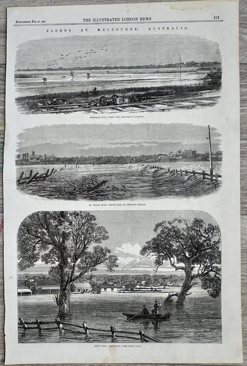 Antique Print, Floods at Melbourne, Australia, 1864, 40.2 x 27.5 cm.