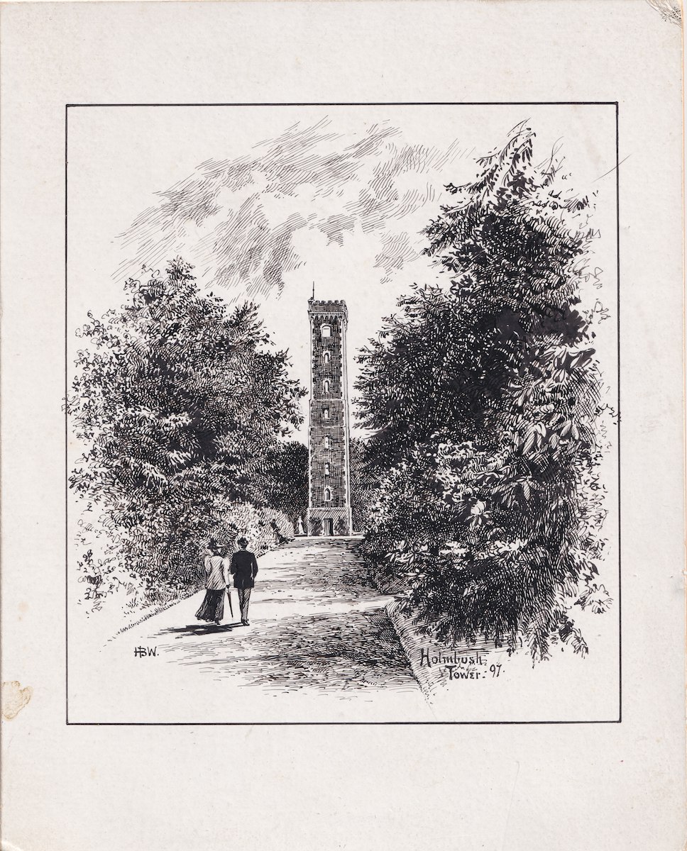 Antique Print, Holmbush Towers, 1897, 19 x 15.3 cm.