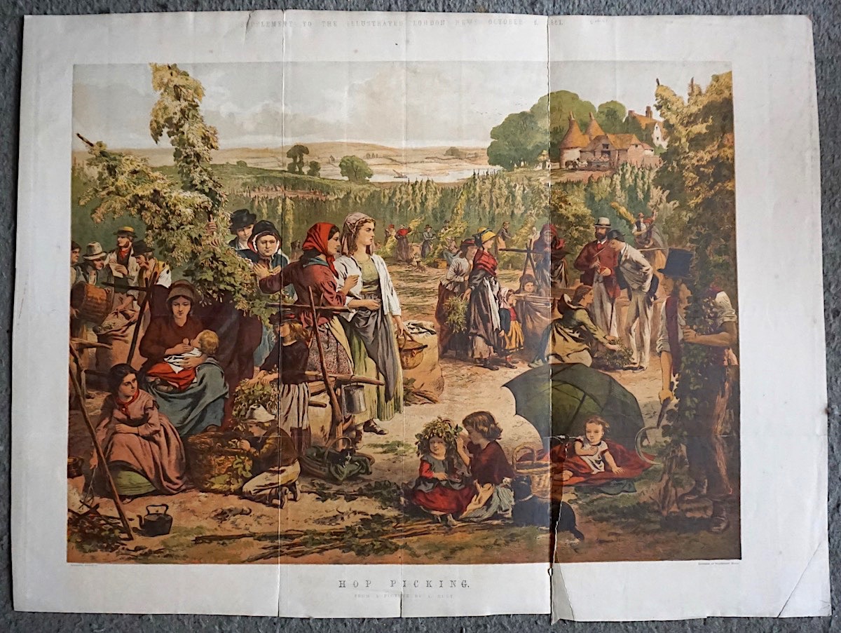 Rare Antique Large Print, Hop Picking, from a picture by A. Hunt, 1867, 67 x 50 cm. Foldable. From Illustrated London News.