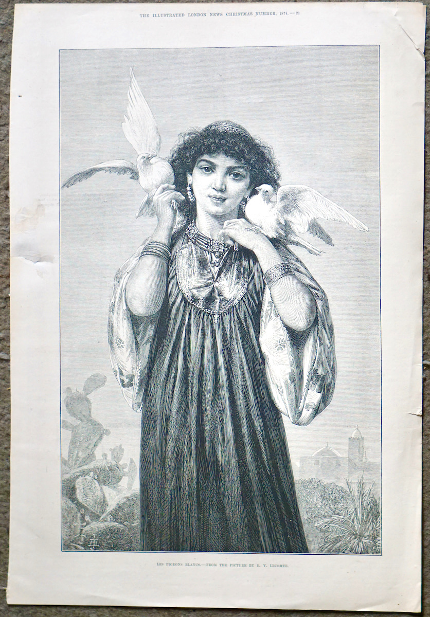 Antique Print, Les pigeons blancs, 1874, 40 x 27.5 cm.