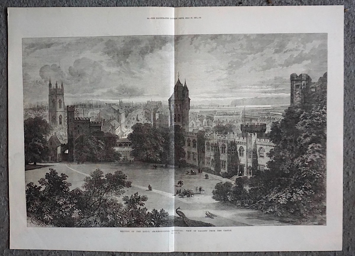 Antique Print, Meeting of the Royal Archeological Institute: view of Cardiff from the Castle, 1871, 54,5 x 39,5 cm. Foldable.