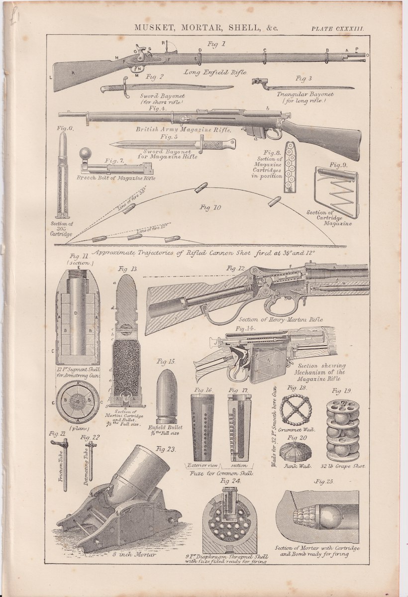 Antique Print, Musket, Mortar, Shell, 1880, credit Antiche Curiosità©