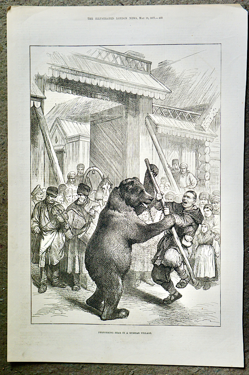 Antique Print, Performing Bear in a Russian Village, 1877, credit Antiche Curiosità©