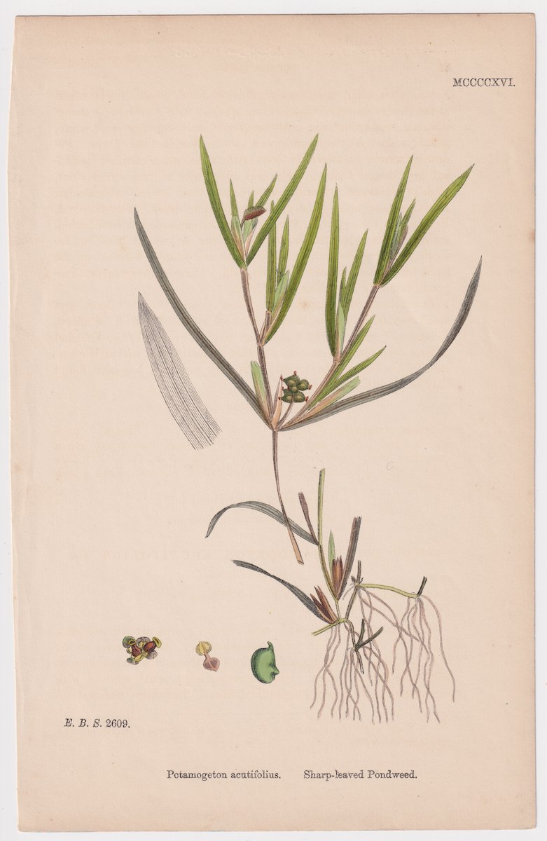 Antique Print, Potamogeton acutifolius, 1865, credit Antiche Curiosità©