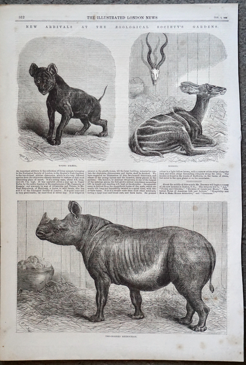 Antique Print, Rhinoceros; Hyaena; Koodoo, 1868, credit Antiche Curiosità©
