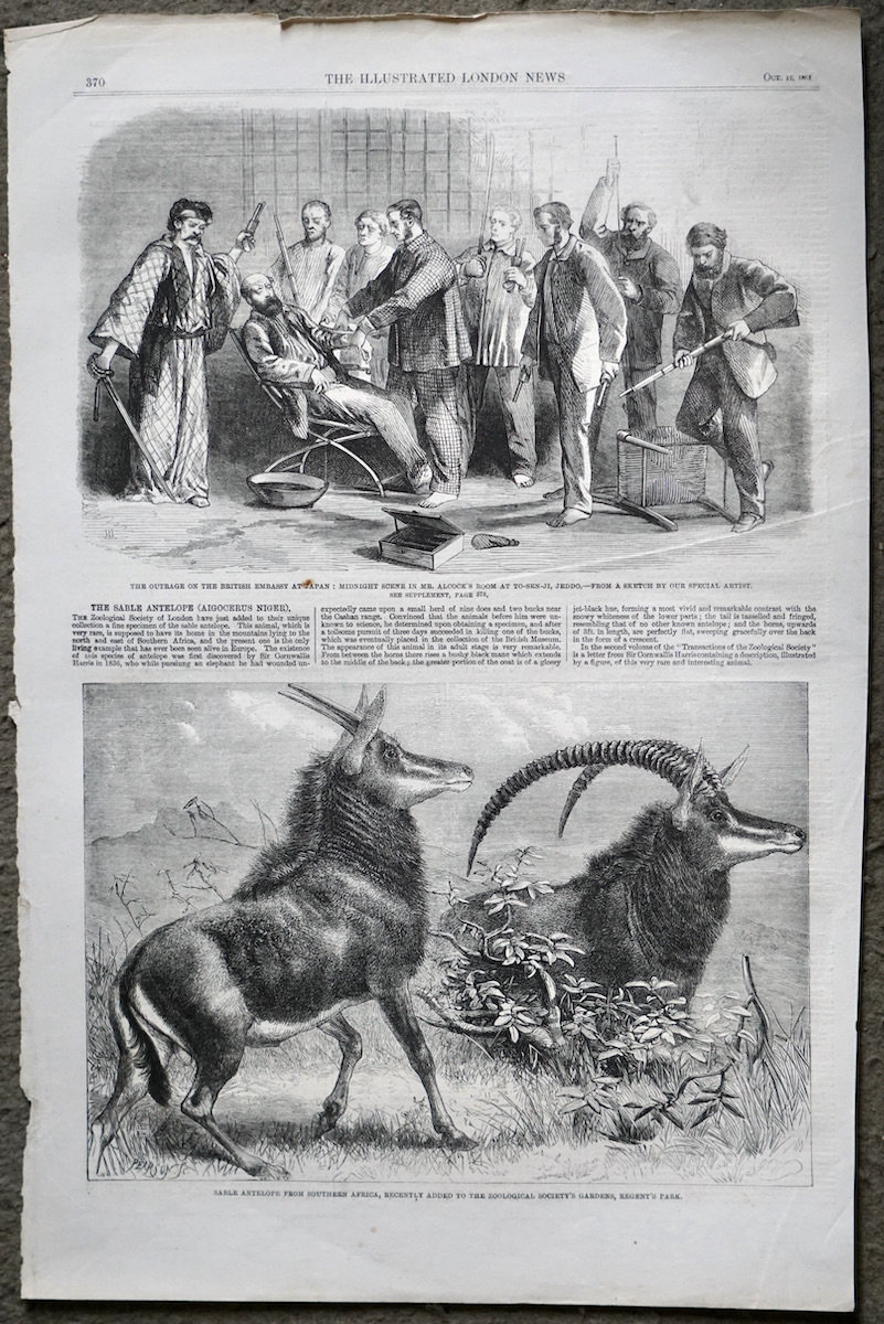 Antique Print, Sable Antelope from Southern Africa; British Embassy at Japan, 1861, 41.5 x 27 cm.