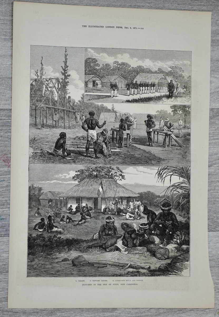 Antique Print, Sketches in the Isle of Pine, 1873, 28 x 40.5 cm.