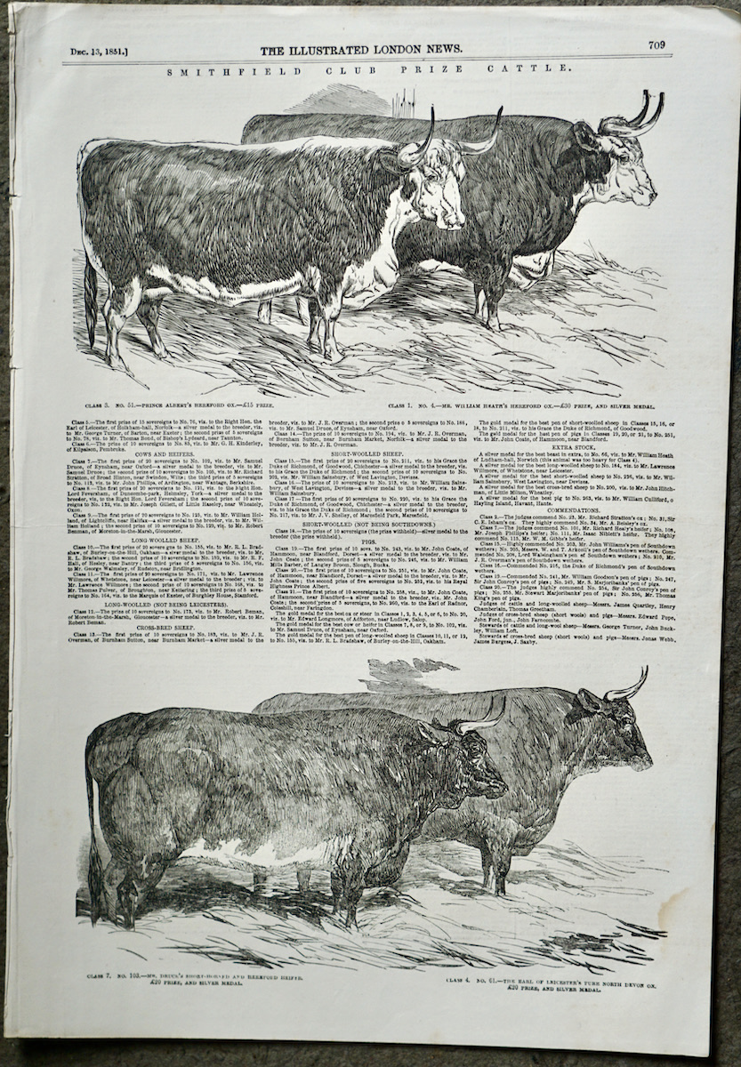Antique Print, Smithfield Club Prize Cattle, 1851, credit Antiche Curiosità©
