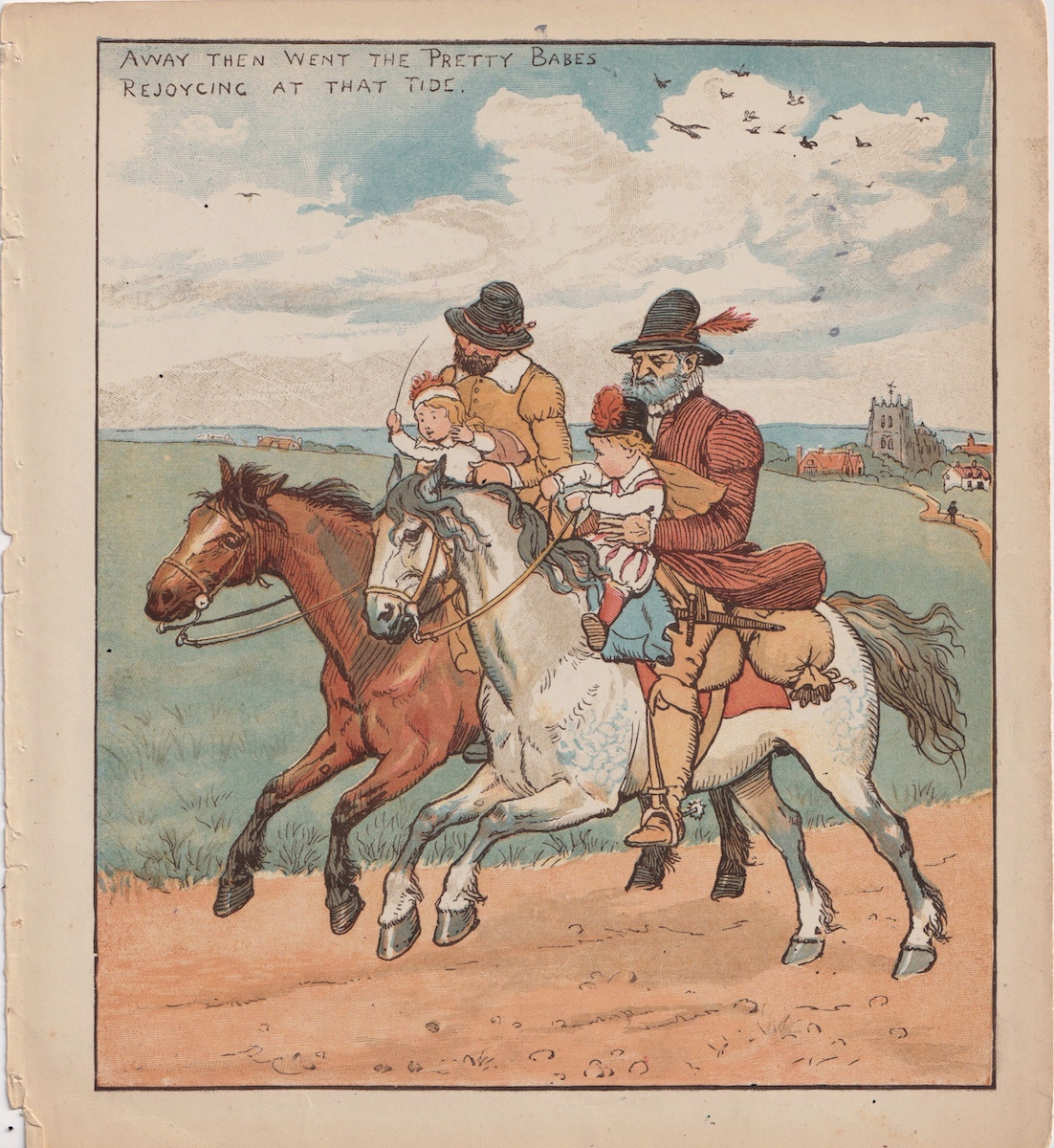 This charming color print is by the renowned Victorian illustrator Randolph Caldecott (1846–1886) and comes from his 1879 picture book adaptation of the traditional English ballad “The Babes in the Wood.” The scene depicts two children—the “Babes”—being taken away on horseback by two ruffians hired by their greedy uncle, unaware of the sinister plot against them. The children’s innocent joy is captured in the phrase at the top of the page: