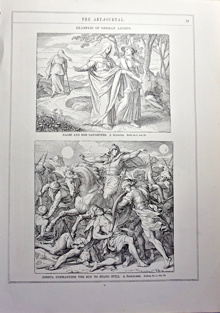 Antique Print, The Force of Temptation; examples of German Artists: Naomi and Her Daughters; Joshua Commanding the Sun to Stand Still, 1870, 32 x 23 cm. Printed on both sides.