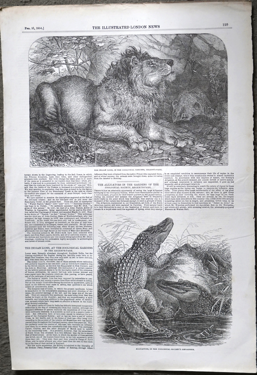 Antique Print, The Indian Lions; Alligators, 1854, 41.6 x 28 cm.