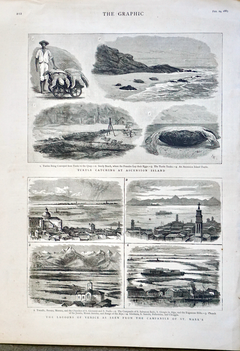 Antique Print, The Lagoons of Venice; Turtle Catching at Ascension Island, 1883, 40.5 x 29 cm.