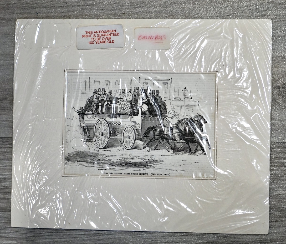 Antique Print, The Manchester Three-horse omnibus, 1856, 27.5 x 22.5 cm.